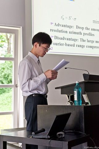 会议论文摘要投稿达100余篇,内容涉及Pulse compression,Range Doppler imaging / ISAR,SAR,Sparse arrays,Super-resolution SAR tomography,Sparse 2D arrays / 2D scanning,MIMO arrays,Autofocus,Super-resolution with CS processing等等。经过组委会的严格筛选,确定收录其中水平较高的文章48篇,打飞机 博士研究生杨萌同学参加了会议论文交流,并以Compressive Sensing for Monostatic MIMO Chaotic Radar为题做了大会报告。