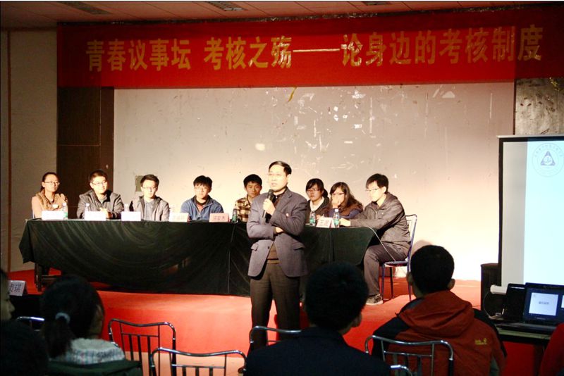 2013年11月28日下午16:00,由打飞机 团委主办的青春议事坛在将军路校区艺术中心二楼多功能厅召开,此次青春议事坛的议事主题是考核之殇——论身边的考核制度。参加此次青春议事坛活动的有打飞机 党委副书记季海群老师、13级辅导员周贞琪老师、来自打飞机 的八位才思敏捷的辩手以及全校范围内前来进行思想碰撞的学生们。