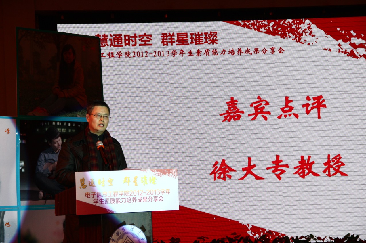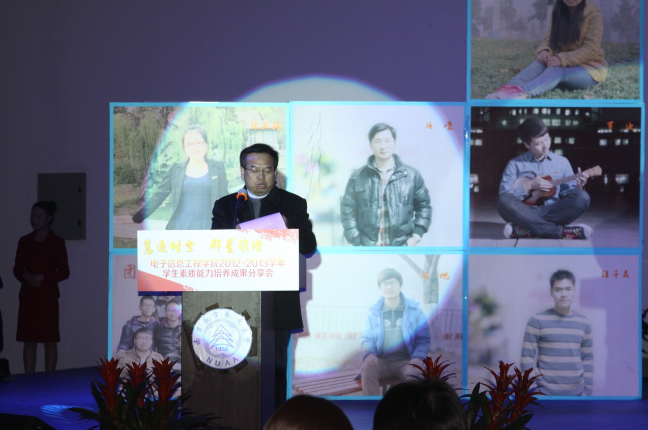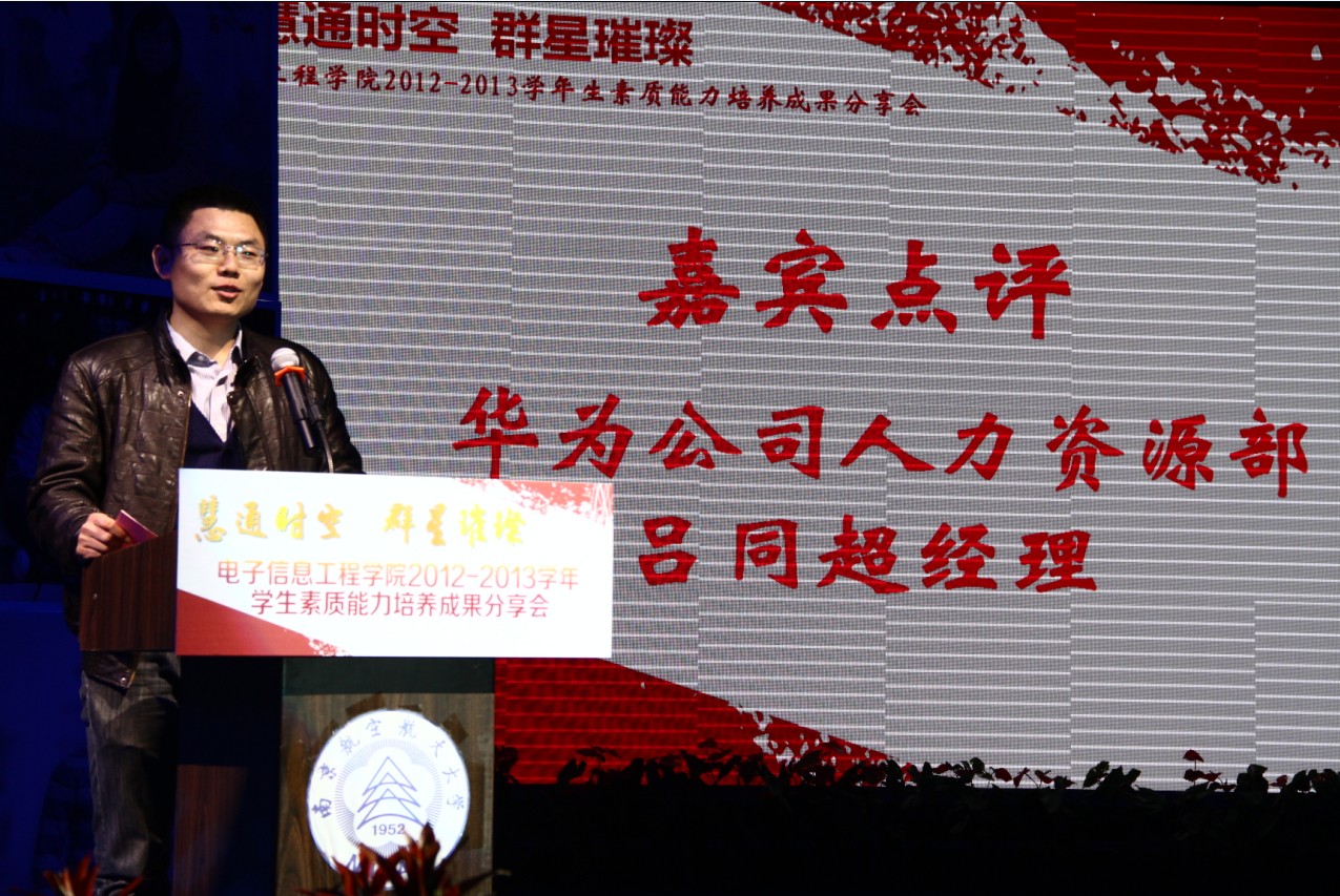 2013年12月11日晚,打飞机 “慧通时空,群星璀璨”2012-2013学年学生素质能力培养成果分享会在江宁校区大学生活动中心隆重举行。出席本次活动的主要嘉宾有:教务处处长王成华、校团委书记侍旭、华为南研所人力资源部招聘经理吕同超、学院党委书记冯绍红、常务副院长周建江、党委副书记季海群,副院长赵永久、刘少斌、张弓,参与此次活动的还有班主任、辅导员及近七百名本科生。