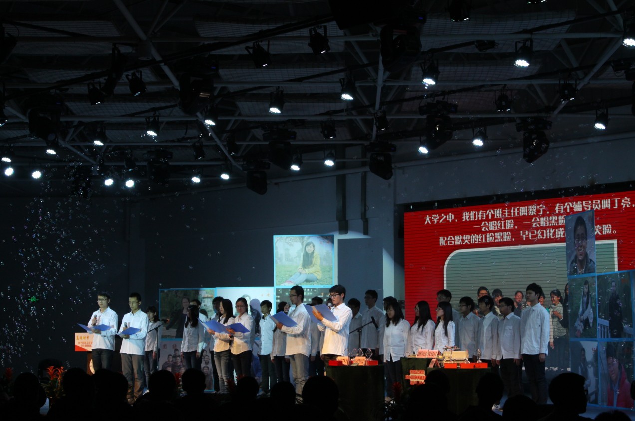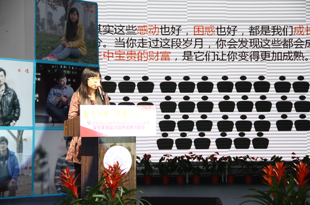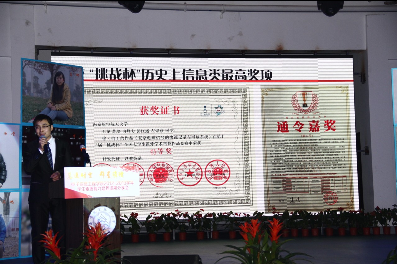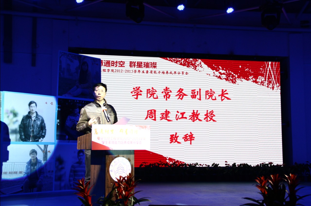2013年12月11日晚,打飞机 “慧通时空,群星璀璨”2012-2013学年学生素质能力培养成果分享会在江宁校区大学生活动中心隆重举行。出席本次活动的主要嘉宾有:教务处处长王成华、校团委书记侍旭、华为南研所人力资源部招聘经理吕同超、学院党委书记冯绍红、常务副院长周建江、党委副书记季海群,副院长赵永久、刘少斌、张弓,参与此次活动的还有班主任、辅导员及近七百名本科生。