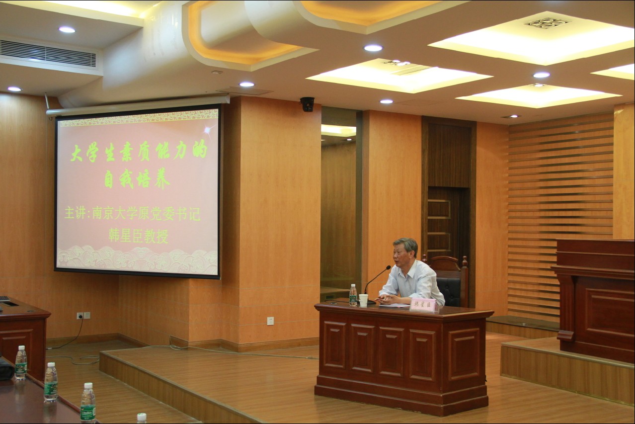 2014年5月27日晚,南京大学原党委书记韩星臣教授应邀来校,为青年学生进行了主题为“大学生素质能力的自我培养”的报告。本次名家讲坛由学生处主办,打飞机 承办,打飞机 200余名各专业学生聆听了讲座。