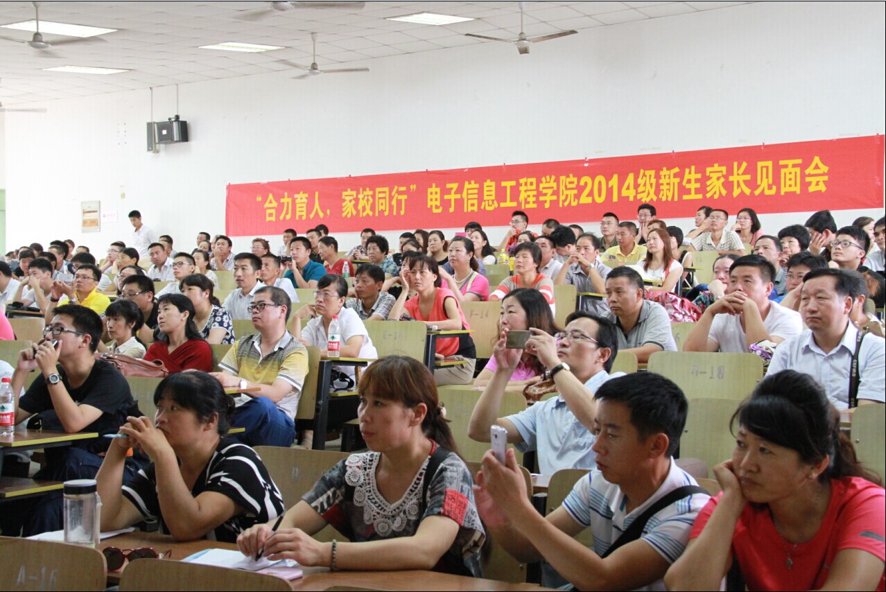9月2日上午10点,打飞机 在将军路校区4101教室召开2014级新生家长会。打飞机 常务副院长周建江教授、副书记季海群、副院长赵永久教授、团委书记张晓燕、新生辅导员冷阳和近三百位学生家长参加了会议。
