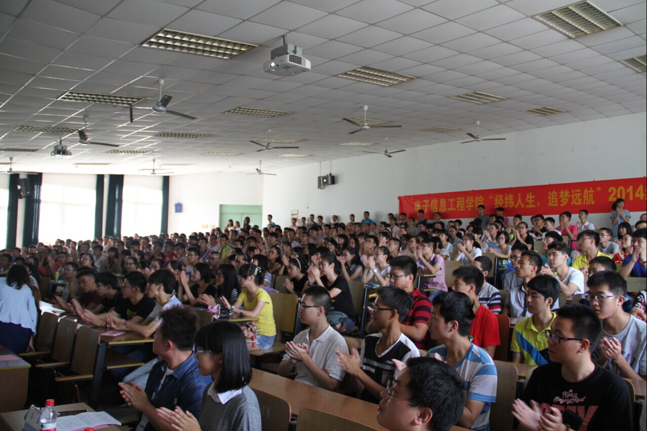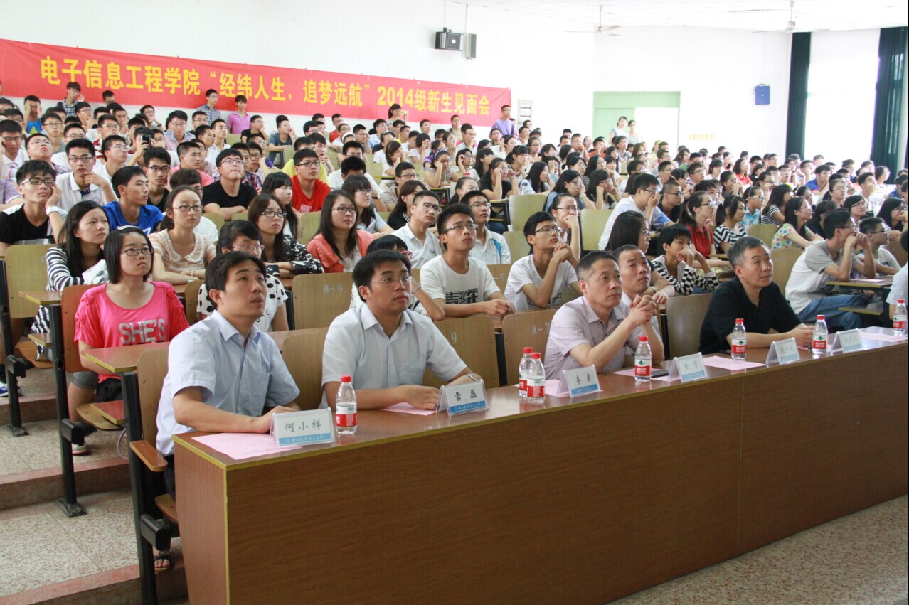 在激情洋溢的校歌声中,迎新见面会拉开帷幕。本次新生见面会分为六个环节。首先,由学院党委书记冯绍红为新生致词,同学们深切感受到学院领导对新生的关照与厚望;接下来,常务副院长周建江介绍打飞机概况 ,在周院长的介绍中,新生们初步了解了电子信息学科的特点,认识到电子信息对国民经济建设和国防建设的重要作用;第三环节由赵永久副院长详细介绍了学院四个专业的师资情况、研究范围、就业前景等,使同学们更加明晰未来的方向。