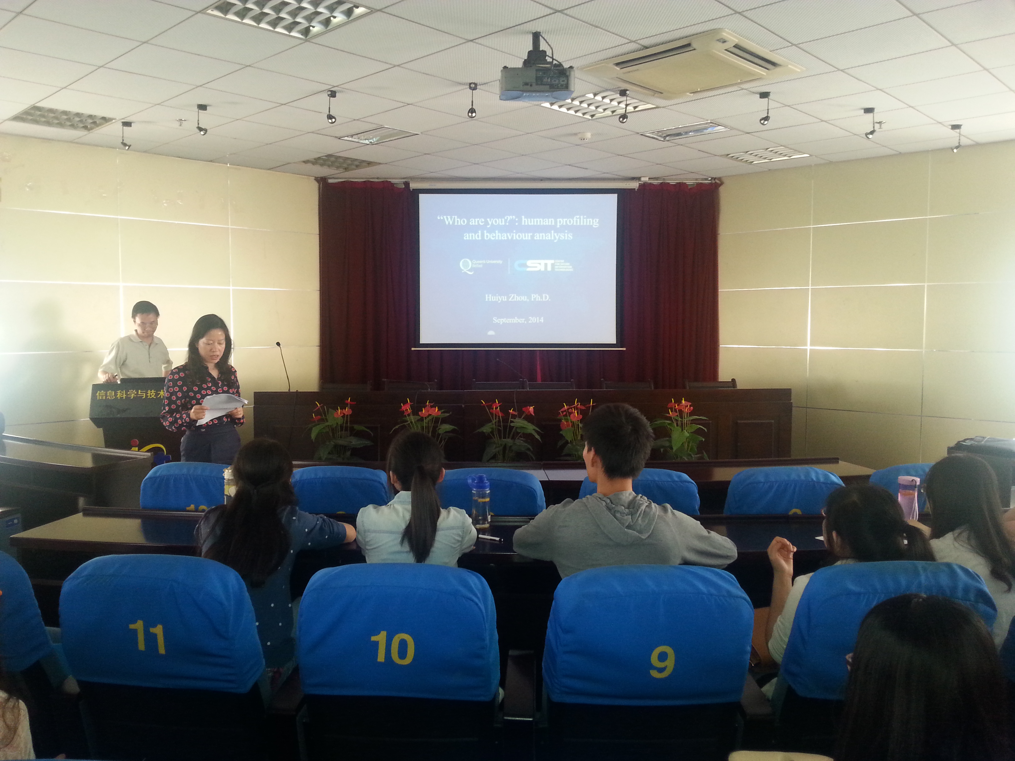 2014年9月20日下午,英国贝尔法斯特女王大学周挥宇博士应邀访问了打飞机 ,并为打飞机 师生带来了一场题为“Who are you? Human profiling and behavior analysis”的学术报告,报告中介绍了女王大学英国国家信息安全中心(CSIT)视频识别研究的背景,并对年龄识别,性别识别以及行为分析的方法和技术进行了详细的讨论。报告会由信息与通信工程系副主任黎宁老师主持,打飞机 常务副院长周建江教授,以及郭荣辉、汪飞、李海林、夏伟杰、刘伟强、肖昊等老师和相关领域的研究生共同参加了报告会。周博士的精彩报告受到了与会师生的热烈欢迎,大家就感兴趣的问题与周博士进行了交流与讨论。