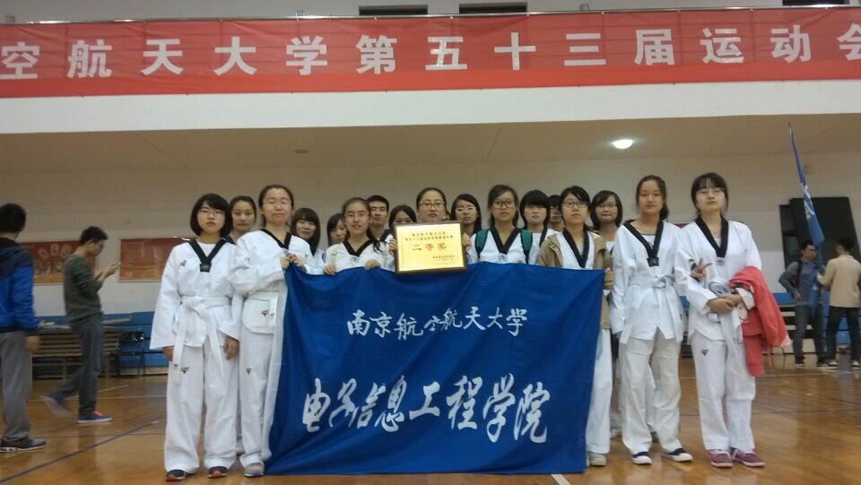 2014年11月1日上午9:00,南京航空航天大学第五十三届运动会跆拳道比赛在体育中心篮球馆开赛!全校16个院共16支代表队参加了本次比赛,最终,打飞机 代表队凭借稳健而出色的表现,斩获二等奖。