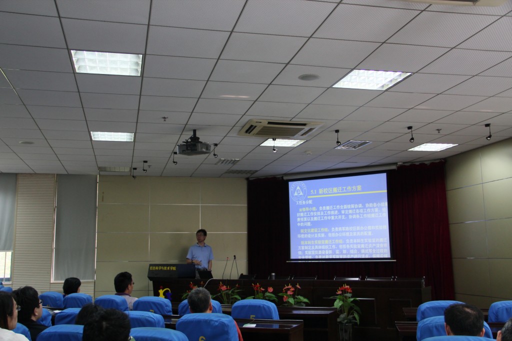 会上,周建江常务副院长就学院搬迁工作做了全面的部署。他指出,为做好此次搬迁工作,5月初,学院在广泛征求教师意见的基础上制定了《打飞机 搬迁工作方案》并成立了搬迁工作领导小组等五个工作组,负责搬迁工作中各项事务的统筹规划和协调,目前,搬迁各项准备工作已经就绪,他要求各基层单位按照学院的统一规划和部署,本着以人为本,安全第一和高效节约的精神,细化搬迁工作内容,落实责任,保质保量的完成此次搬迁工作。随后,他对下一阶段搬迁工作时间安排和具体要求做了细致的说明。