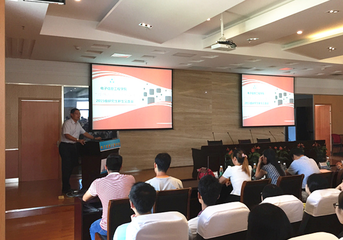在一段学院宣传片之后,新生见面会正式开始。首先,由副院长赵永久教授介绍打飞机概况 及研究生培养概况,对学院的简况、师资队伍、教学成果、实验室配置、专业设置、人才培养、导师职责等方面进行了介绍,并且对导师以及学生提出了宝贵的建议。随后,第四届“良师益友---我最喜爱的导师”张小飞教授作为导师代表进行发言,激励同学们尽快适应研究生的学习生活,努力钻研,不断创新。接下来,院研究生会副主席方凯同学发言,从在校生的视角与所有新生一起共勉。紧接着,由新生代表金灿同学发言,展现着新生们对未来的美好憧憬,发出了成为电子信息领域领航人的铮铮誓言。