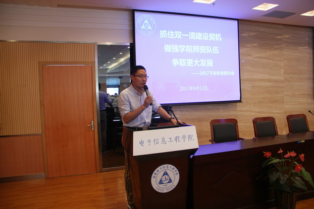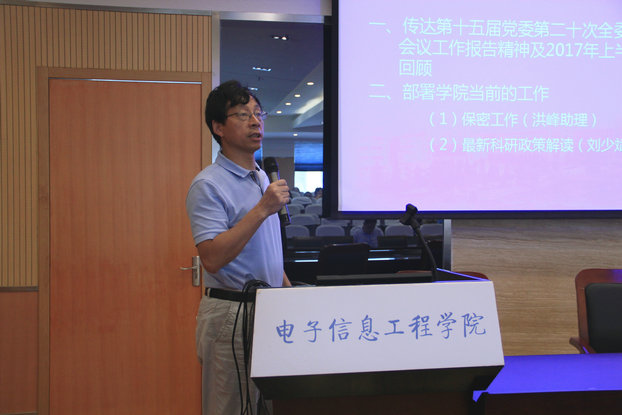 常务副院长周建江作了《抓住‘双一流’建设契机,做强学院师资队伍,争取更大发展》的报告,全面传达了聂宏校长第十五届党委第二十次全委(扩大)会议的工作报告精神,以“双一流”建设目标为主线,回顾学校2017年上半年在党建与思想政治、人才培养、师资队伍、学科建设、科研能力、办学条件和国际化等方面取得的成就;部署学校2017下半年工作重点,并结合报告内容对学院工作进行了总结和部署。周院长强调,全院教职工要抓住‘双一流’建设契机,做强学院师资队伍尤其是相关学科方向的学科带头人引进,争取学院更大发展。针对即将开展的保密资格审查认证工作,周院长要求每一位教师员工思想上高度重视,行动上切实落实。