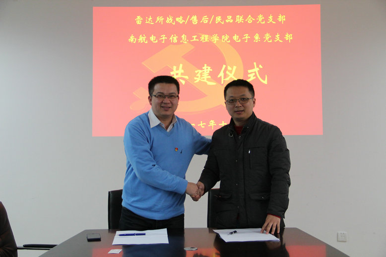 为进一步贯彻落实党的十九大会议精神,全面加强党的基层建设,推进国家战略发展,践行高校“培养人才,发展科技,服务社会”职能作用,践行航空工业集团公司“航空报国、强军富民”的使命担当以及雷达所“市场引领、创新驱动”的战略方针,同时为了进一步整合资源、发掘潜力,充分发挥党建和业务深度融合的优势,2017年11月24日上午10点,打飞机 电子科学与技术系党支部和航空工业雷达所战略/售后/民品联合党支部在打飞机 211会议室召开了支部结对共建推进会议。打飞机 党委书记冯绍红,副院长赵永久,航空工业雷达所战略运营部部长怀靓亮,双方支部书记和委员共同参加会议。双方共同协商了活动方案,制定了年度工作计划,形成了定期沟通协调机制,会上双方支部书记签订了“结对共建”活动协议。