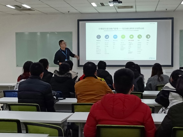 在研发中心二区,人力资源部门经理为同学们详细介绍了公司的岗位结构以及各岗位需求的基本素养、中兴公司完备的人才培养模式、着重人才养成的蓝鲸计划及其国内罕有的导师方案。打飞机 18届研究生、中兴俱乐部前任主席吕中兴学长为参观同学们分享了他对于打飞机的理解,以及公司对员工细致入微的人文关怀;另一位南航校友徐胜友先生介绍了他在通讯行业近二十年的丰富从业经历并对同学提出的疑问进行了解答。