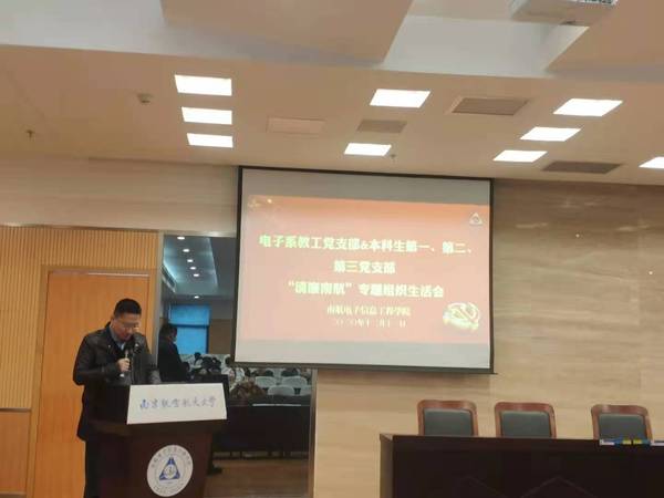 2020年12月11日,打飞机 院电子系教工党支部与本科生第一、第二、第三党支部在学院515报告厅进行支部共建,联合召开“清廉南航”专题组织生活会和“互学互助月”党日活动,学院副院长刘伟强同志以学院纪检委员身份出席本次会议,党委副书记雷蕾同志以支部普通党员身份参加会议。