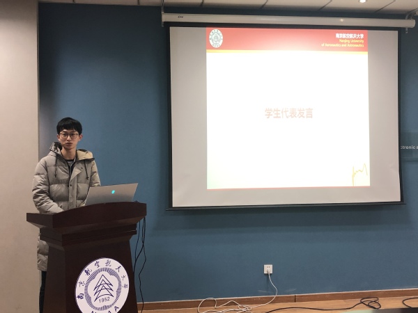 接下来,王立晗同学作为获奖代表上台发言。王立晗同学作为队长,带队参加了第六届“互联网+”江苏省大学生创新创业大赛和第十一届“挑战杯”中国大学生创业计划竞赛,分别获得一等奖和金奖,并于2020年6月获校本科毕业生“大学成就奖”,12月获校长通令嘉奖。作为博士生,他主动联机,在VIVO通信研究院院长秦飞来实验室参观之际,与秦飞先生讨论5G通信目前的关键技术和难题。借此大会之际,王立晗同学对潘时龙教授、王祥传副教授和徐艳惠辅导员的全力支持和悉心指导表示了衷心的感谢,也向同舟共济的队友表示了衷心的感谢。