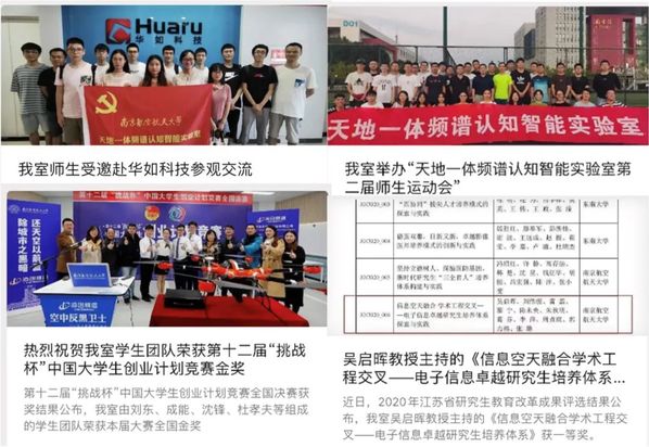 在宣传文化方面,团队注重增强有形文化建设,师生共同参与到实验室LOGO和队歌的创作中。团队成员也在设计创作中加深了对实验室研究领域的了解,并提高了各自的艺术创造力。线上,运营实验室网站(//cog.dafj.net/)和公众号(天地一体频谱认知智能实验室),通过宣传学生获奖和最新进展等方面全面展示团队的风采。线下,定期组织实验室参观交流以及与外校研究生交流合作等活动,激发学生的创新思维。