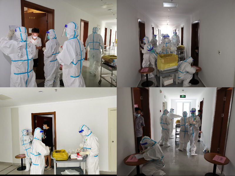 教职工志愿者队伍配合医生顺利完成了近两百名集中观察学生的核酸检测工作。当志愿者老师们看到自己正在隔离的学生,关切地询问他们的身体情况。暑日闷热,防护服内已浸满汗水,教职工志愿者们表示更能够切实体会一线医务工作者及志愿者的不易与辛劳,向他们致敬!同时,他们表示能为学生们服务是十分高兴且义不容辞的事情,也希望南航师生们能够平安健康,共同打好这场疫情阻击战!