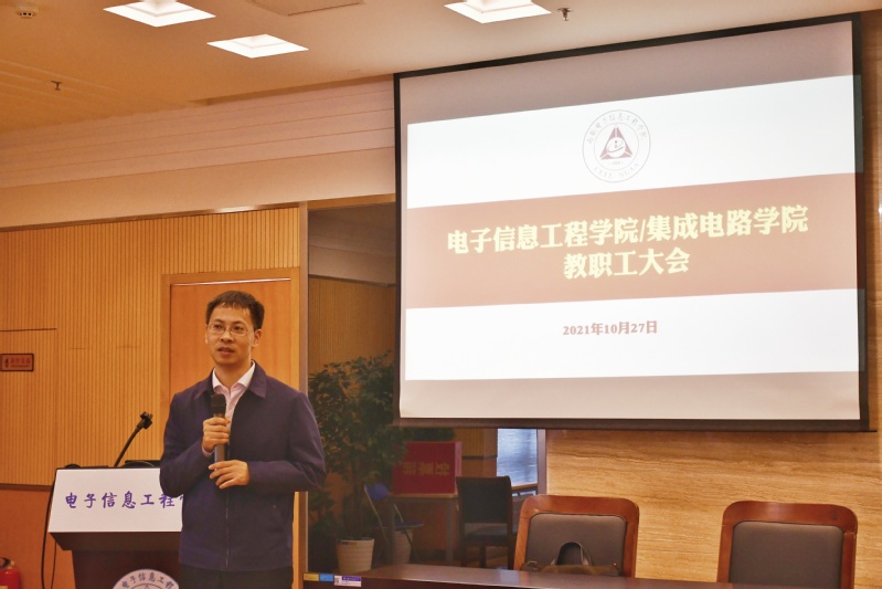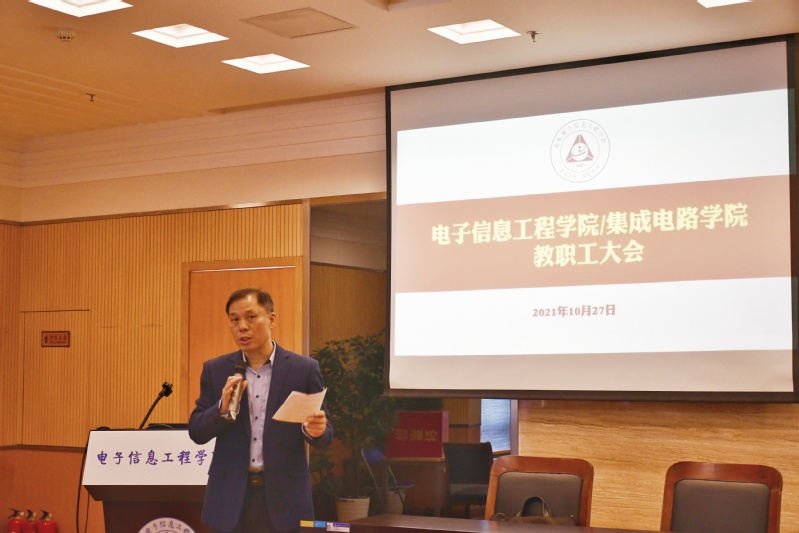 10月27日,打飞机 /集成电路学院召开全院教职工大会。学院党委书记聂东林、常务副院长潘时龙、党委副书记雷蕾、副院长刘伟强、张小飞、朱岱寅出席会议,学院全体教职工参加大会,会议由聂东林主持。会议传达了上级和学校相关会议精神,就当前学院工作特别是安全相关工作进行部署。