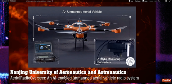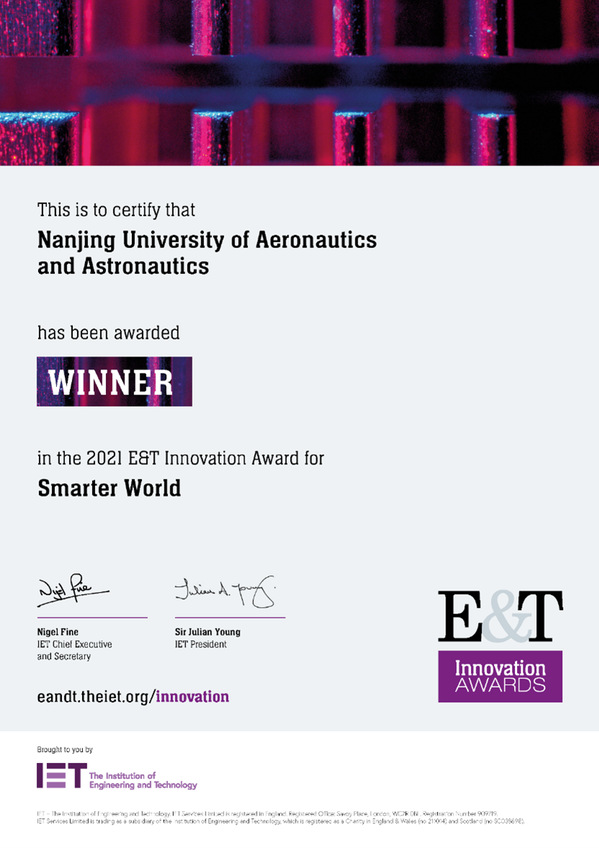 “Smarter World”领域颁发的E&T全球创新奖面向全球最具智能且对人类生活有便利的智能系统。今年获得该领域提名的有三项,包括英国高科技公司Toumetis研发的“Cascadence - Power Transmission & Distribution Predictive Analytics”、英国上市公司SP Energy Networks研发的“Angle DC Pioneering smarter electricity distribution to enable a fair and net zero community”和南京航空航天大学研发的无人机频谱认知仪“AerialRadioOverseer: An AI-enabled unmanned aerial vehicle radio system”。最终,南京航空航天大学吴启晖教授及团队成员周福辉教授、韩路工程师、冯斯梦副研究员、黄洋副教授、兰天旭(学生)、徐铭(学生)凭借频谱信号智能采集,无人机协同智能控制和频谱数据智能处理等创新技术,以及无人机频谱认知仪在及时发现、精确定位和智能追踪微弱信号等方面的优势,最终获得2021年“Smarter World”领域的IET全球创新奖。