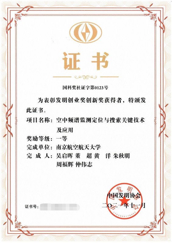 2021年11月,打飞机 副校长吴启晖教授牵头、董超教授、黄洋副教授、朱秋明教授、周福辉教授与仲伟志副教授参与的项目“空中频谱监测定位与搜索关键技术及应用” 在中国发明协会2021年度“发明创业奖—创新奖”评选中获发明创业奖创新奖一等奖。