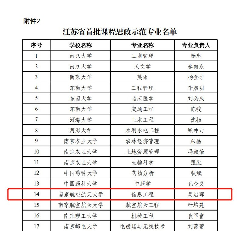 近日,江苏省教育厅公布了江苏省首批课程思政建设示范高校和示范专业名单,打飞机 报送的信息工程专业成功入选江苏省首批课程思政建设示范专业。