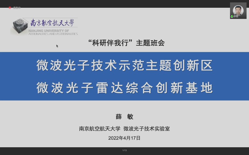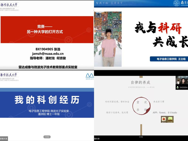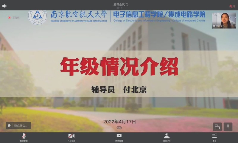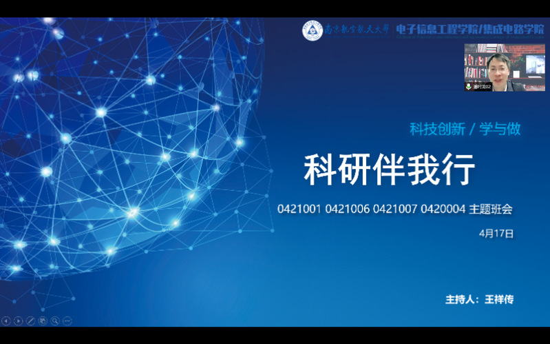 4月17日下午3点,我院0420004、0421001、0421006、0421007班采用线上线下结合的方式举办了“科研伴我行”主题联合班会。参会人员有常务副院长潘时龙教授、薛敏副教授、王祥传副教授、唐震宙副研究员、辅导员付北京、微波光子学实验室博士生以及4个班级120余名学生。本次联合班会包含21级学生生活学习情况介绍、本科主题创新区和综创基地介绍、竞赛获奖经验分享等多个环节。会议由0421007班班主任王祥传主持。