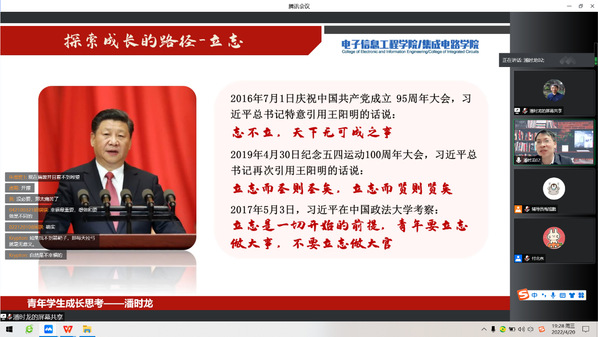 潘时龙围绕“幸福”和成长”两个主题,讲述当代青年获取幸福的能力、健康成长的方法。结合带领团队在科研过程中攻克困难的经历,用“励志、勤学、改过、择善”的路径解读成长的过程,在疫情之下,帮助青年学生形成对人生的正确态度,引领奋斗成长。
