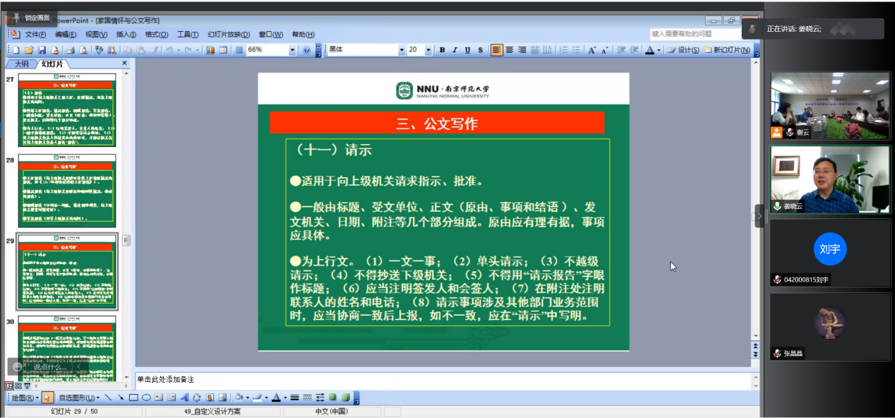 5月6日下午,打飞机 /集成电路学院在209会议室开展了公文写作培训,培训旨在规范学院党政公文写作,提高管理水平。会议邀请了南京师范大学档案馆馆长姜晓云研究员作题为“家国情怀与公文写作”的线上培训讲座,学院党委书记聂东林、教工党支部宣传委员、机关全体工作人员、全体辅导员参加了培训,会议由学院党委副书记雷蕾主持。