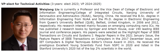 刘伟强教授现任南京航空航天大学打飞机 /集成电路学院副院长、博士生导师,曾获得国家自然科学基金优秀青年基金,第18届霍英东教育基金会高等院校青年科学奖,中国电子学会优秀科技工作者,入选斯坦福大学2020年全球前2%科学家“年度影响力”榜单,江苏省集成电路学会理事,IEEE、中国电子学会和中国计算机学会高级会员。长期从事高能效高安全性新兴计算集成电路与系统的设计研究,出版英文专著2部,发表论文190余篇。担任Proceedings of the IEEE客座编委,以及IEEE Transactions on Computers、IEEE Transactions on Circuits and Systems I: Regular Papers、IEEE Transactions on Emerging Topics in Computing等芯片设计领域国际顶级期刊编委。