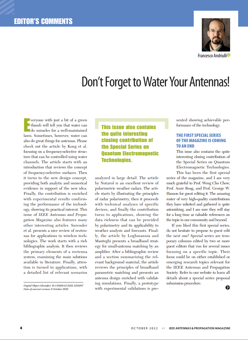 杂志主编Francesco P.Andriulli教授在编者按中以《别忘记给天线系统“浇水”》为题,指出每个有一些环保意识的人都会告诉你,水可以为维护良好的草坪创造奇迹。然而,有时水也可以为天线系统做很多事情。请查看Kong等人发表的论文,专注于利用水通道控制的频率选择结构。文章首先介绍了频率选择表面的概念。然后转向新的设计理念,提供分析和数值仿真来支持新理念。最后,作者通过实验结果证实了理论贡献,证实了该技术的性能,显示了它的实际意义。论文引领本期杂志封面以环保材料水为背景进行设计,在天线与天线罩、天线反射面一体化设计中提出了创新性方案,影响深远。