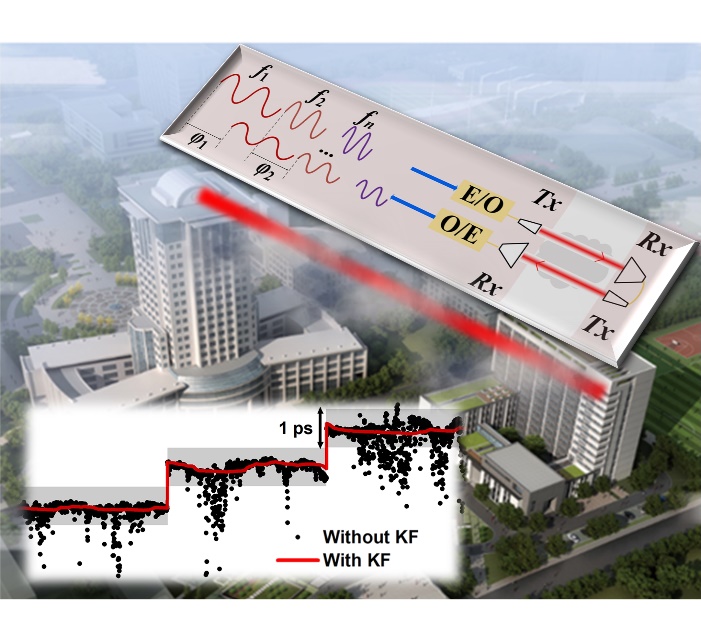 南京航空航天大学微波光子学实验室提出了一种相推测距创新方法,仅需要1 MHz的带宽就可以实现亚皮秒级的测量精度。在此基础上,针对大气光载射频链路,采用卡尔曼滤波有效抑制大气湍流造成的测量误差,在 1 km大气光载射频链路中实现了亚皮秒量级的绝对延时测量,测量结果与结构复杂的光频梳系统一致。该方法可以精确表征大气湍流引起的时间抖动,进行光载射频链路中的绝对延时抖动的高精度补偿,最终实现分布式系统中的时间同步。该工作中,链路的时间抖动标准差为0.28 ps, 阿伦方差为1.9 × 10−19 @ 1000 s, 可以满足微波毫米波信号的同步需求。