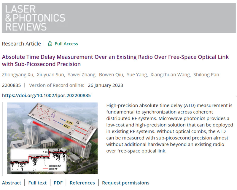 2023年1月26日,打飞机 微波光子学实验室徐忠扬副教授和潘时龙教授团队在国际知名光学期刊Laser & Photonics Reviews上以“Absolute Time Delay Measurement Over an Existing Radio Over Free-Space Optical Link with Sub-Picosecond Precision”为题发表学术论文。该工作采用一种结构简单,低成本的测量方法,在不改变大气光载射频链路结构的情况下,实现亚皮秒精度的链路绝对延时测量。该方法可用于构建分布式相参射频系统。徐忠扬副教授和孙修远博士为论文共同第一作者,潘时龙教授为论文通讯作者。