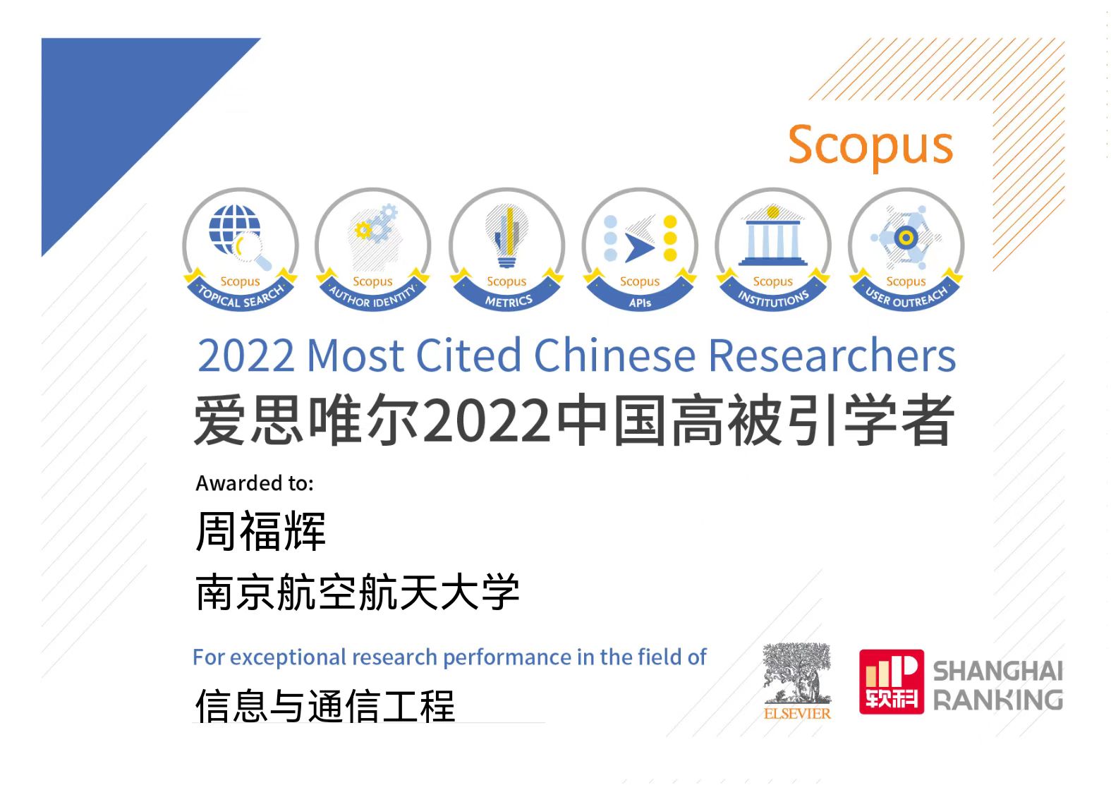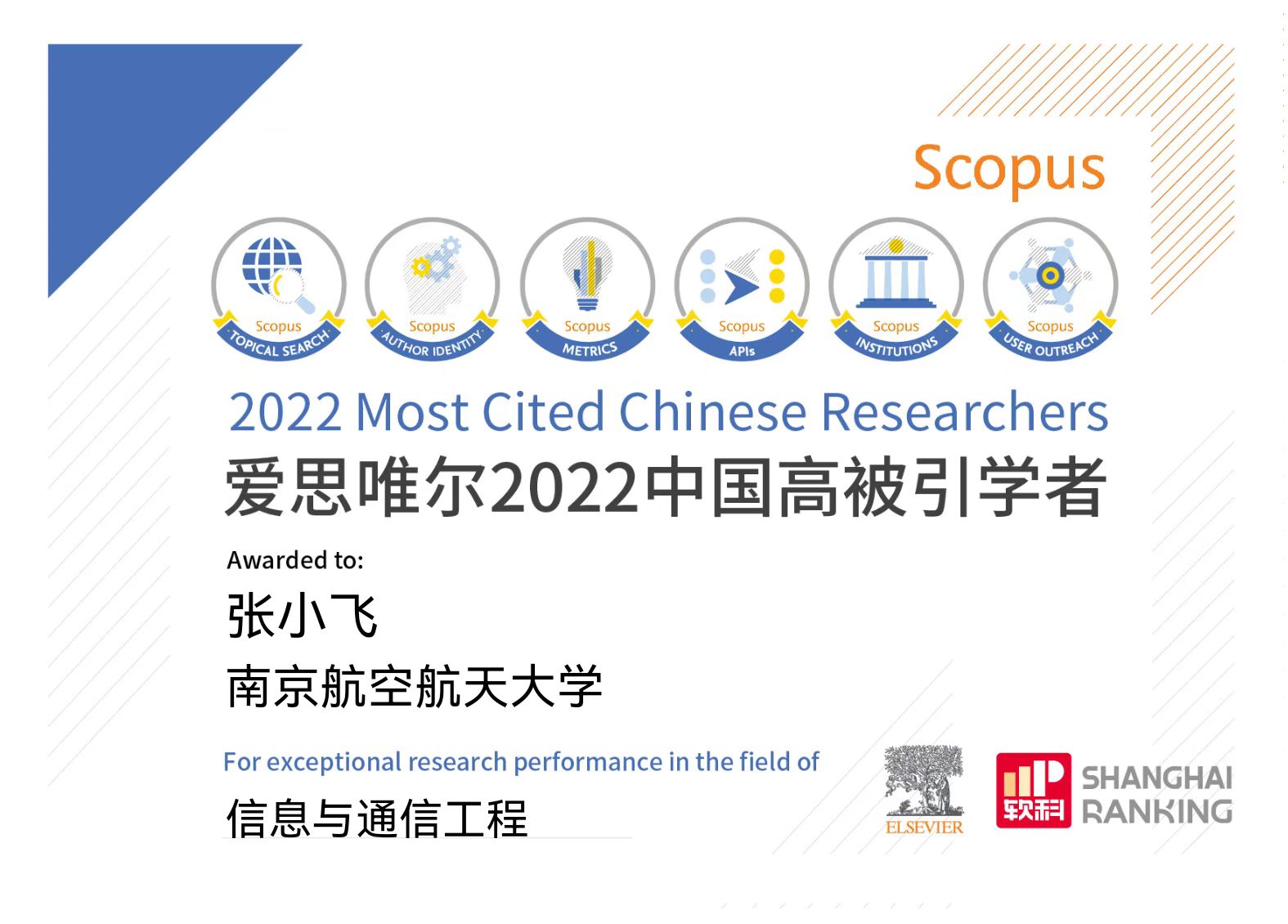2023年3月28日,爱思唯尔(Elsevier)正式发布2022“中国高被引学者”(Highly Cited Chinese Researchers)年度榜单,该榜单覆盖10个教育部学科领域中的84门一级学科,介绍了5216名各学科最具全球影响力的中国学者。打飞机 共有30位学者上榜,其中,打飞机 潘时龙、张小飞、周福辉三位教授入选“信息与通信工程”学科领域榜单,这也是三位教授继2021年上榜后再次成功入选该榜单。
