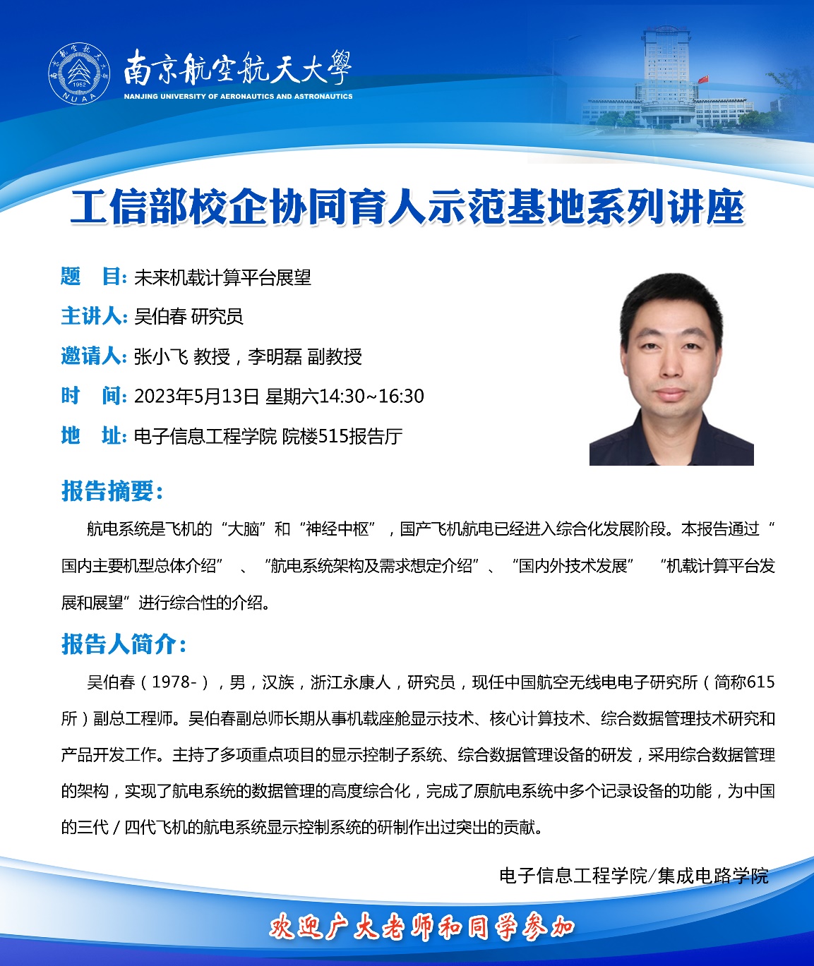 2023年5月13日,中国航空无线电电子研究所(简称615所)吴伯春研究员受邀来打飞机 打飞机 /集成电路学院做题为“未来机载计算平台展望”的专题讲座。