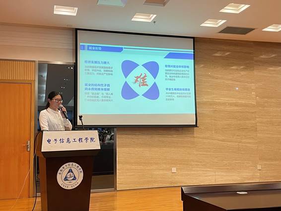 辅导员刘惠欣以当前就业现状引入话题,结合行业趋势、地域选择等多视角的全面分析,帮助学生准确把握当前就业形势。通过对学院近五年就业去向数据进行分析,她鼓励同学们树立正确的就业观,充分发挥自身优势和才能,积极应聘多种类型岗位,早就业就好业。同时也希望同学们在职业选择中将个人发展与国家需求结合,争做担当民族复兴大任的时代新人。