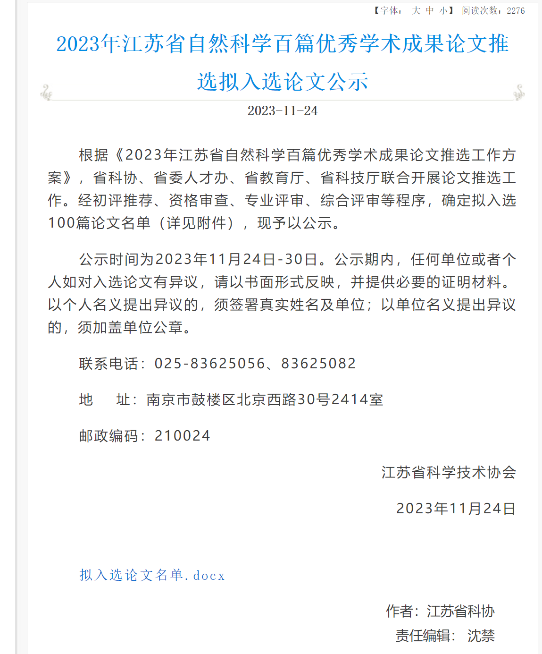 2023 年江苏省自然科学百篇优秀学术成果论文是首次由省科协、省委人才办、省教育厅、省科技厅开展的江苏省自然科学百篇优秀学术成果论文推选工作。论文推选实行推选单位初评、学科集群专业评审组复评、推选委员会终评制度。最终选出100篇论文需要具有原创性的科学研究或技术创新成果,能够反映所在学科领域的最高水平的学术研究成果。