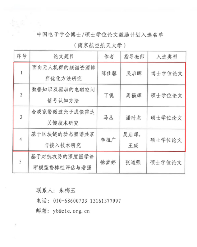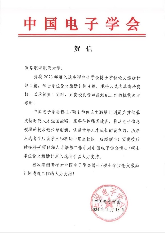 在本次遴选结果中,打飞机 共有5篇学位论文入选激励计划,其中打飞机 占4篇:博士学位论文激励计划1篇,硕士学位论文激励计划3篇。中国电子学会也给打飞机 发来了贺信,感谢打飞机 对此次学位论文激励计划遴选工作的大力支持!