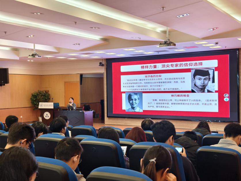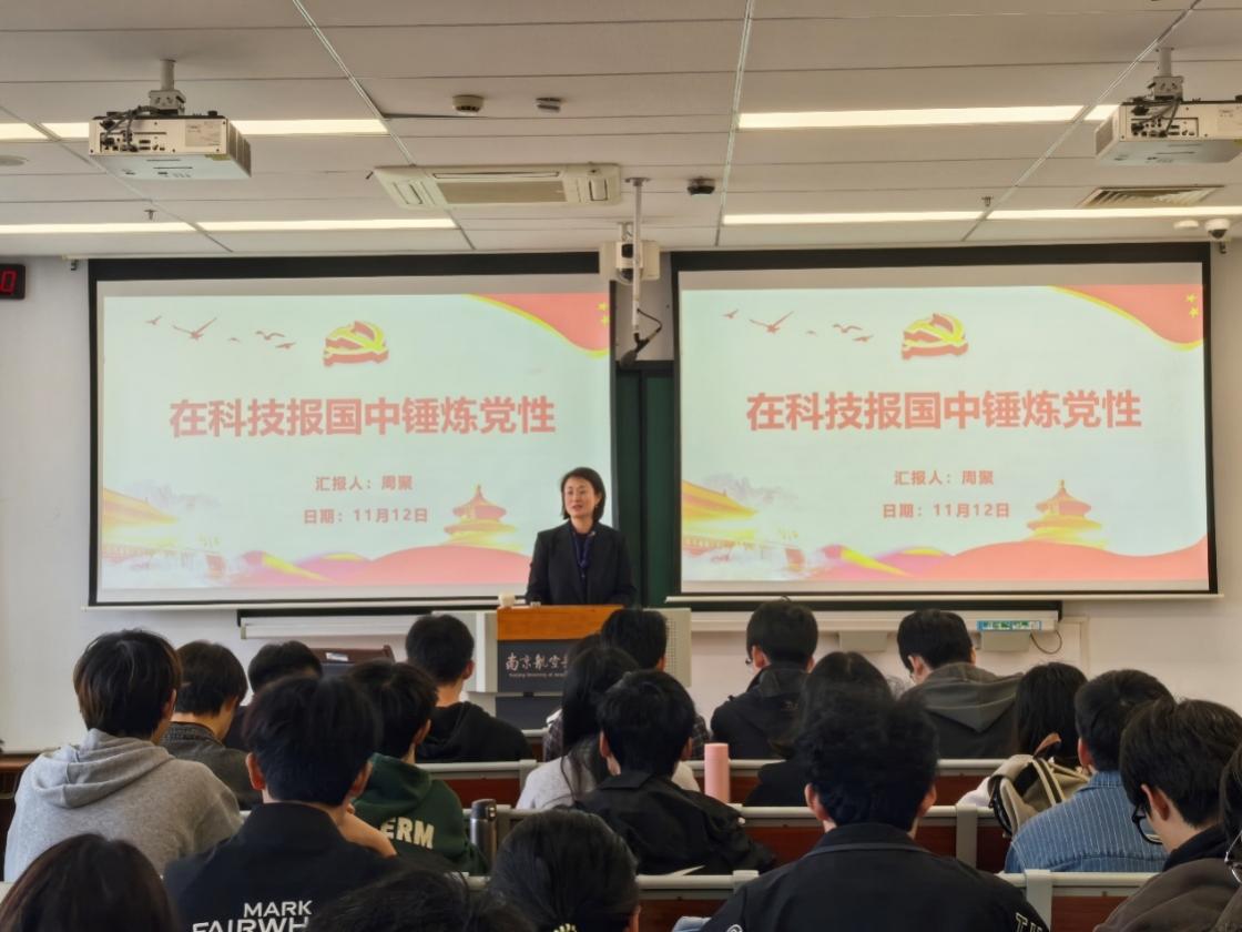 打飞机 思政专员、马克思主义学院李晶文老师以“为‘中国芯’注入中国心”为主线开展专题讲座。她从“党员意味着什么”切入,引导学员思考世界观、人生观、价值观的塑造,阐述党员身份的庄严与担当。她结合钱学森、林巧稚等科学家的信仰故事,讲述信仰与理想的力量,深入剖析科技创新背后的制度优势与价值取向。她号召青年学生坚定“四个自信”,践行科技报国责任,将个人理想融入党和国家发展目标。