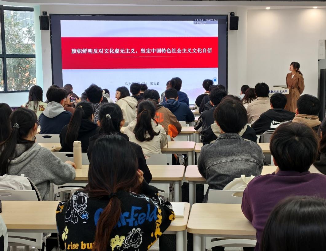 集成电路学院思政专员、马克思主义学院张文君老师主讲《旗帜鲜明反对文化虚无主义,坚定中国特色社会主义文化自信》。她从“文化虚无主义”的叙事方法出发,结合现实案例深入剖析文化虚无主义的现实表现与深层危害,明确指出其错误本质与消极影响。她引导学员们要增强防范意识与辨别能力,自觉抵制文化虚无主义,牢固树立中国特色社会主义文化自信。