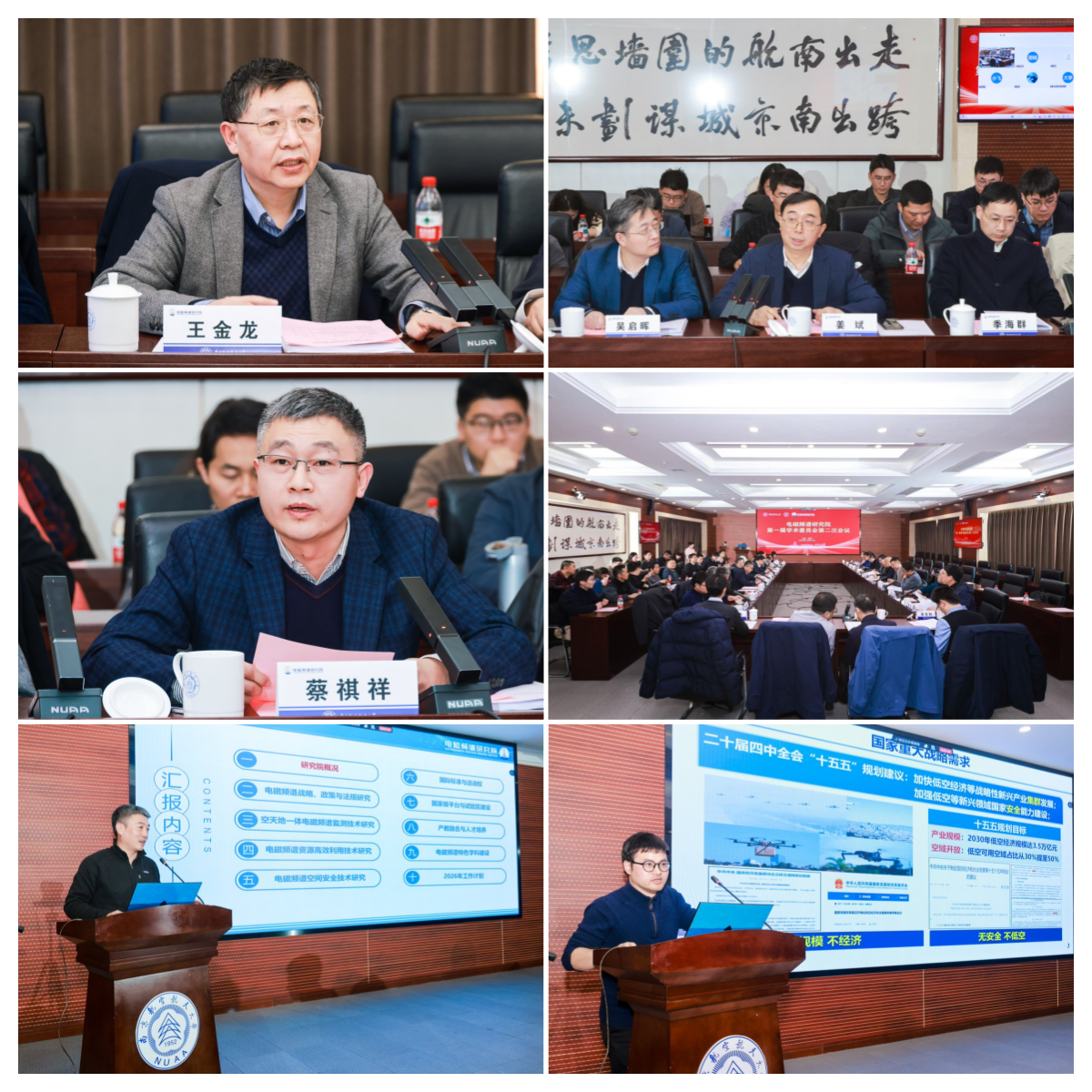 本次会议共有12位学术委员会委员出席,分别是中国科学院院士、陆军工程大学王金龙教授,南京航空航天大学黄志球教授,西安电子科技大学李赞教授,南京理工大学丁大志教授,东南大学王承祥教授,电子科技大学唐万斌教授,复旦大学高跃教授,东南大学黄永明教授,中电科第二十二研究所郭兰图研究员,深圳大学全智教授,军事科学院杨健研究员,中电科第三十六研究所郑仕链研究员。此外,会议还邀请了5位特邀专家,分别是工信部无线电管理局频率规划处谭海峰处长,江苏省工信厅无线电管理局金雷局长,中国电子学会学术交流处余文科处长,中国电子学会学术交流处张杰项目主管,哈尔滨工程大学林云教授。南京航空航天大学出席人员包括:校长姜斌,副校长吴启晖,发展规划与学科建设处副处长蔡祺祥,打飞机 党委书记季海群,电磁频谱研究院兼打飞机 副院长董超与研究院核心骨干成员。