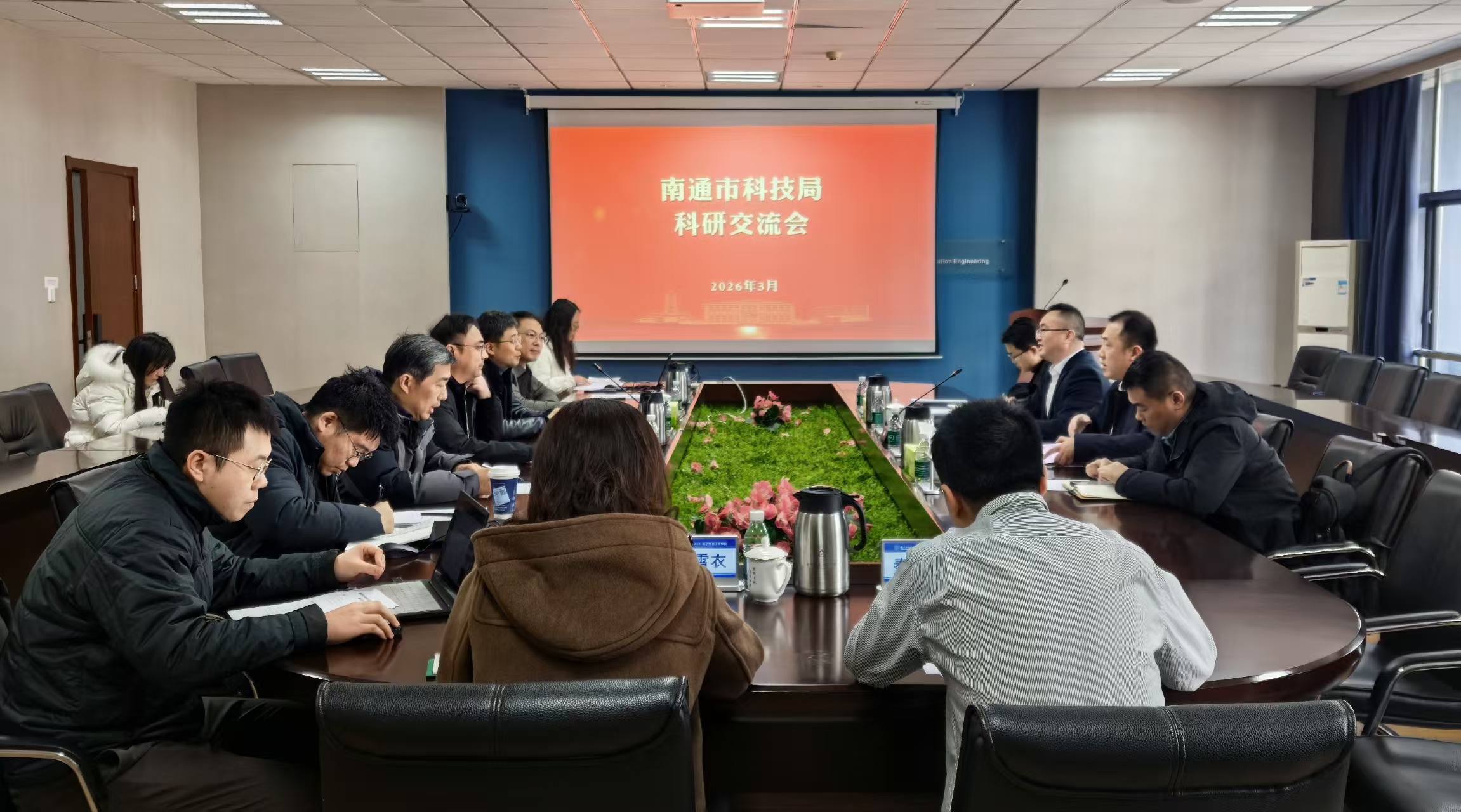 2026年3月13日,南通市科技局副局长吴卫东、科研机构处处长纪光熙、副处长甘兴旺及相关科室人员来打飞机 开展科研交流座谈活动。打飞机 副院长朱岱寅、院长助理王祥传及相关教师代表参加座谈会。