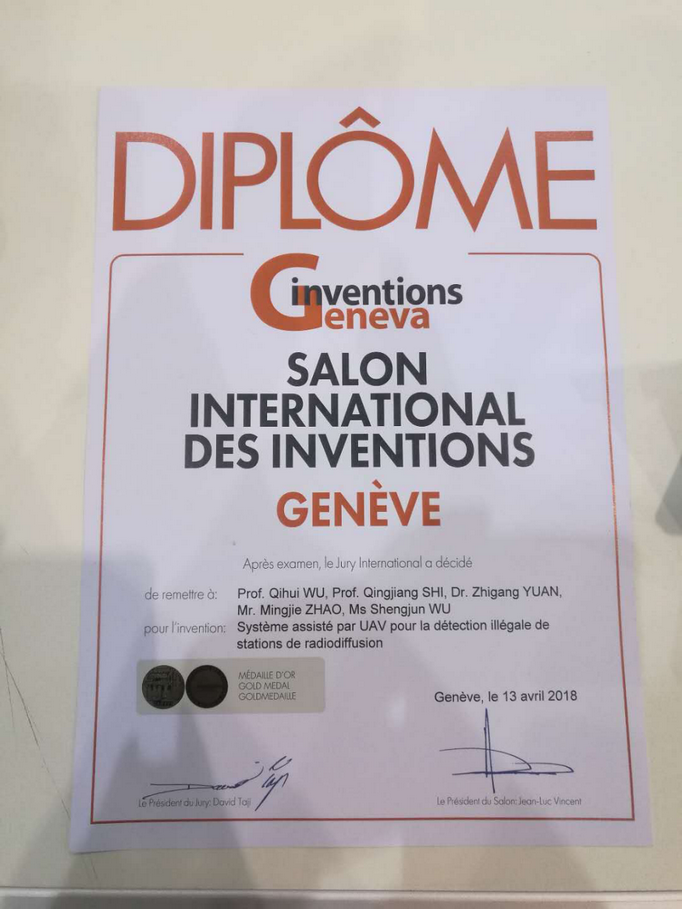 第46届日内瓦国际发明展于2018年4月11日至4月15日在瑞士日内瓦Palexpo会展中心举行,由打飞机 打飞机 参展的“UAV-Assisted System for Illegal Broadcasting Station Detection(基于无人机平台的非法广播电台搜索定位系统)”斩获金奖。该成果由长江学者吴启晖教授、史清江教授、袁志刚与黄洋副教授、戚楠讲师带领赵明杰、吴盛君、管鑫硕士、胡田钰本科生等人共同完成。