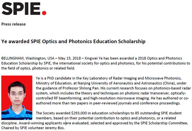 近日,2018年度国际光学工程学会光学与光子学教育奖学金(SPIE Optics & Photonics Education Scholarship)评选结果揭晓,打飞机 雷达成像与微波光子技术教育部重点实验室在读博士生叶星炜同学荣获该奖项。此次奖学金共授予85位获奖者,其中国内仅有两个人获奖,分别是清华大学的郭强(音)和南京航空航天大学的叶星炜。