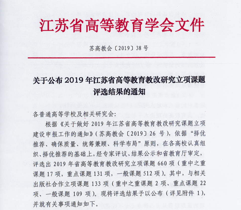 2019年12月10日,江苏省高等教育学会发布了《关于公布2019年江苏省高等教育教改研究立项课题评选结果的通知》,打飞机
