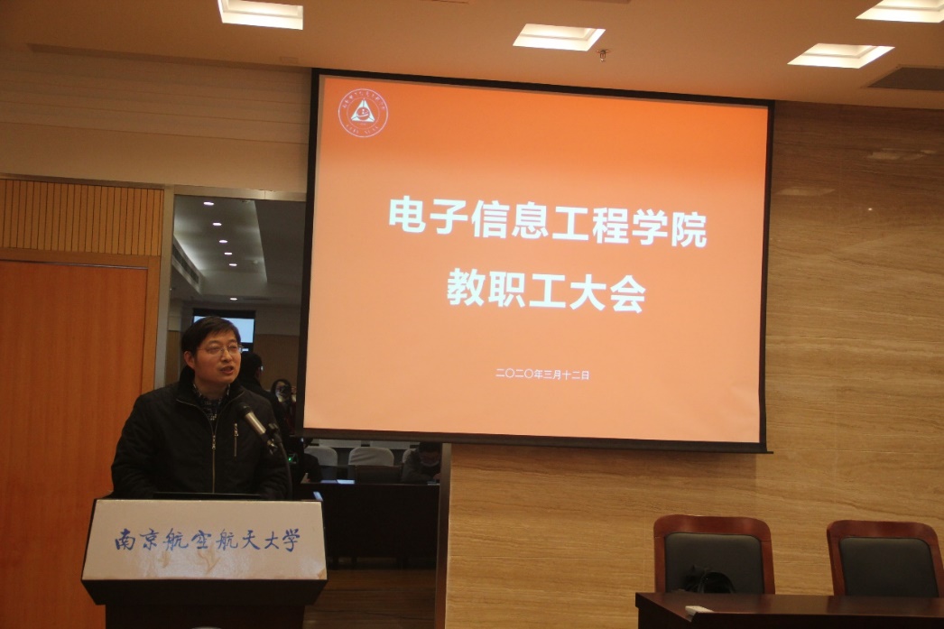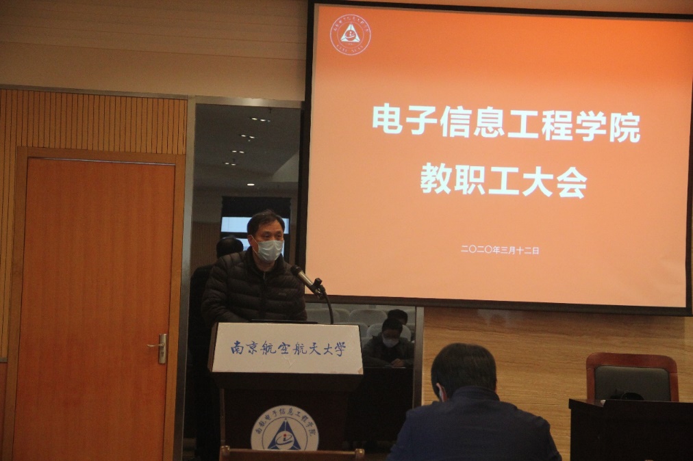 校长助理,常务副院长吴启晖作了“强化科学简约高效治理,再创学院发展新高度”的大会报告。他首先对老师们在战“疫”期间所表现出的识大局、守本责的精神态度和工作热情表示感谢。报告总结了2019年学院的主要工作与取得的成绩,2019年学院整体建设工作出色,在全校KPI考核评估中,整体工作考核位列全校第3;国家科技进步奖取得突破,获2019年全校唯一的国家科技进步二等奖,实现了学院零的突破;师资队伍建设提质显著,人才集聚效应初见成效;研究生培养质量提升工程稳步展开;信息工程获国家一流专业建设点;学生科创工作成绩突出;绩效改革继续向前,学院绩效按照“守底线、讲传承、突贡献”的思路展开获得广大教职员工的肯定。吴院长强调学院2019年的成绩是学院师生共同努力下取得的,是在秉承“争创一流学科,培养一流人才”的初心,“咬定青山不放松”的拼劲下获得的,体现了打飞机 师生“朝气蓬勃、积极向上”的战斗力。